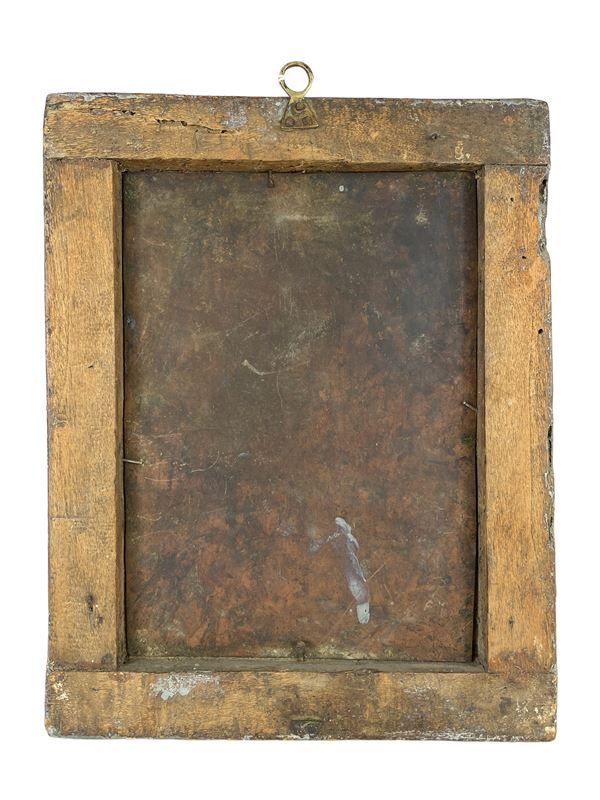 Vergine con Bambino, olio su rame, in cornice in legno dorato. Italia centrale. Diversi punti di caduta di colore sulla superficie pittorica.