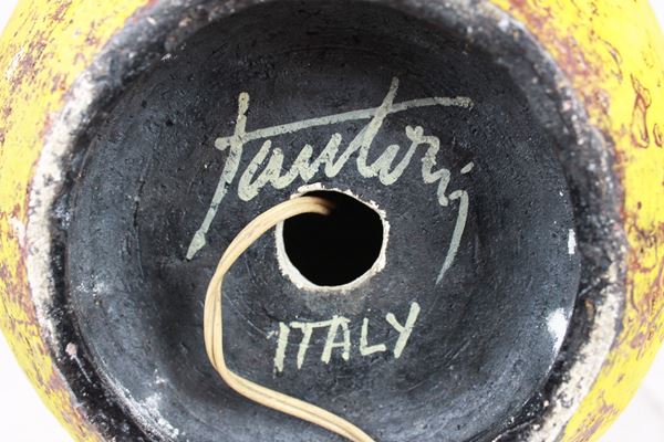 in ceramica giallo limone, con corpo periforme con fascia orizzontale convessa, piccola sbeccatura lungo la fascia, anni 60/70. Marcato sotto la base