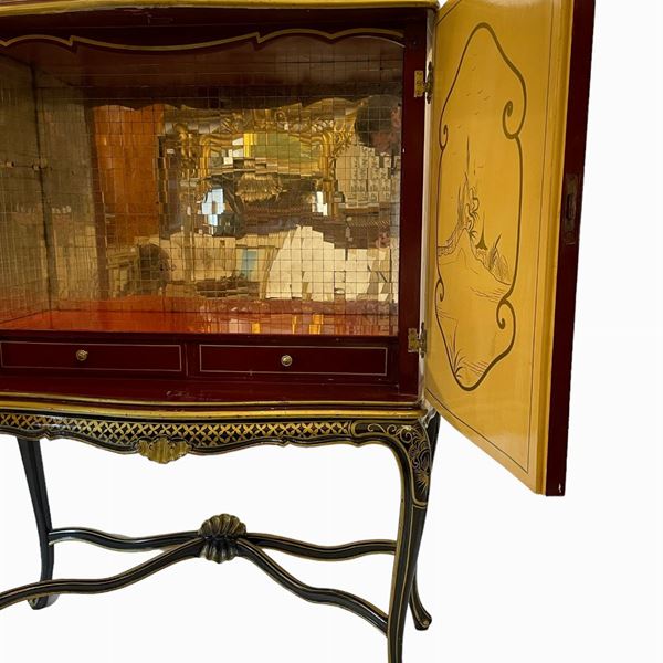 Mobile bar a due sportelli in legno a lacca rossa ed oro con scene di paesaggi dall'estremo oriente, poggiante su base in legno con quattro gambe a virgola, raccordate alla base, in legno a lacca nera ed oro. Interno a lacca crenesi e specchi, con un ripiano e due cassetti. Piano in vetro rosso all'interno, rotto da una parte. Produzione nazionale.