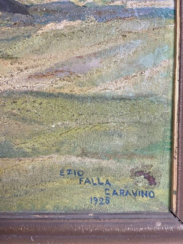 Firmato Ezio Falla Caravino e datato 1925 in basso a destra. Entro cornice. Presenta uno strappo della tela in basso a sinistra.