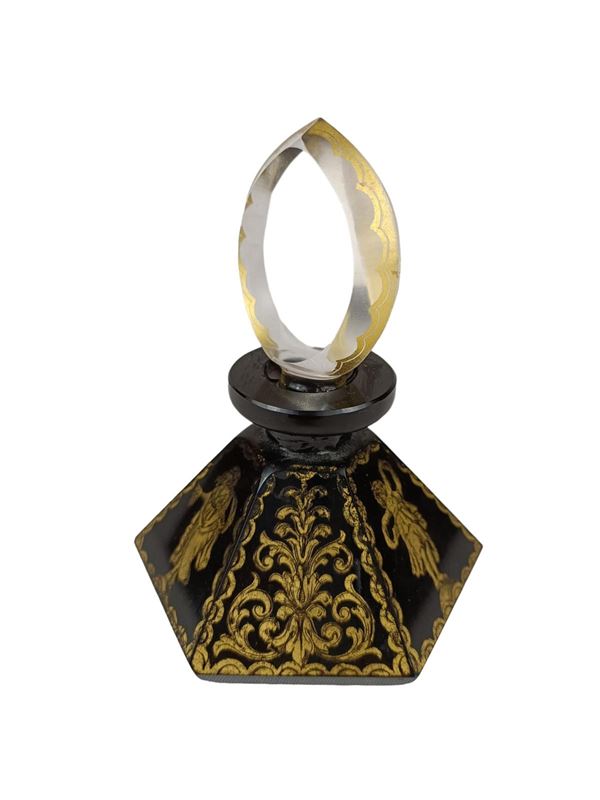 A base esagonale. Fondo nero con lumeggiature oro. Completo di tappo.
