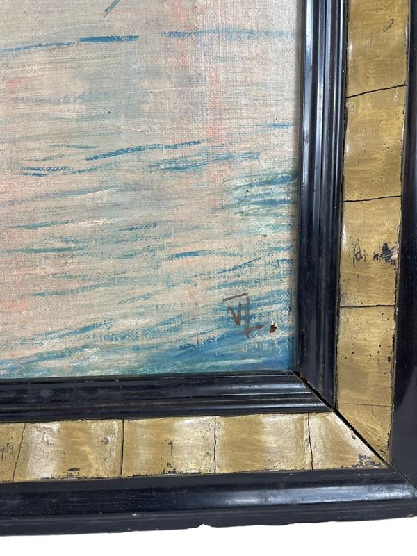 Siglato in basso a destra. Entro cornice. Presenta buchi e mancanze di colore.