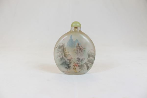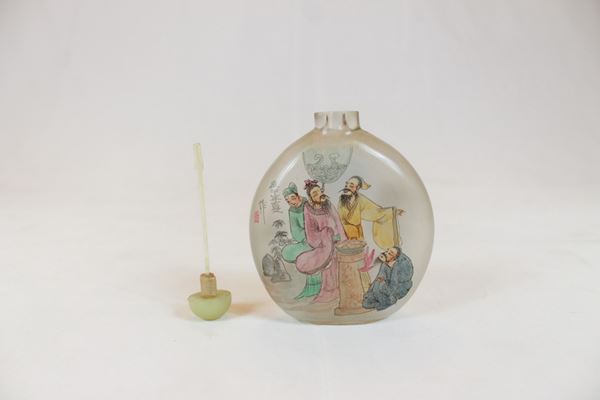 in frosted glass, decorated with oriental characters on the front and landscape with wayfarer on the back. With yellow glass stopper.