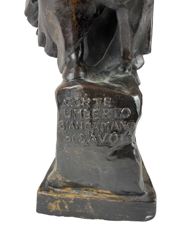Scultura in volume di Umberto Biancamano in terraglia forte a patina bruna. Piccole rotture e mancanze. Parti restaurate.