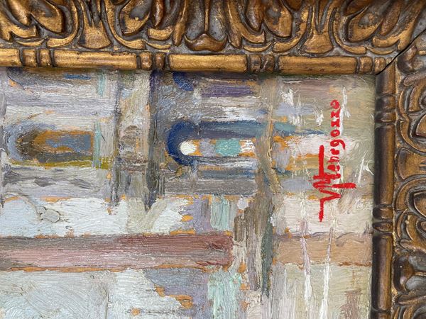 Dipinto ad olio su tavola, veduta di Venezia, entro cornice, firmato al verso in basso a destra.