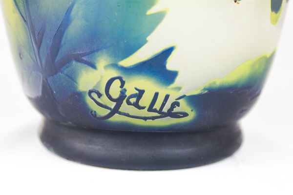 In vetro satinato, con decoro a motivi vegetali e grappoli d'uva. Firmato Gallé alla base.