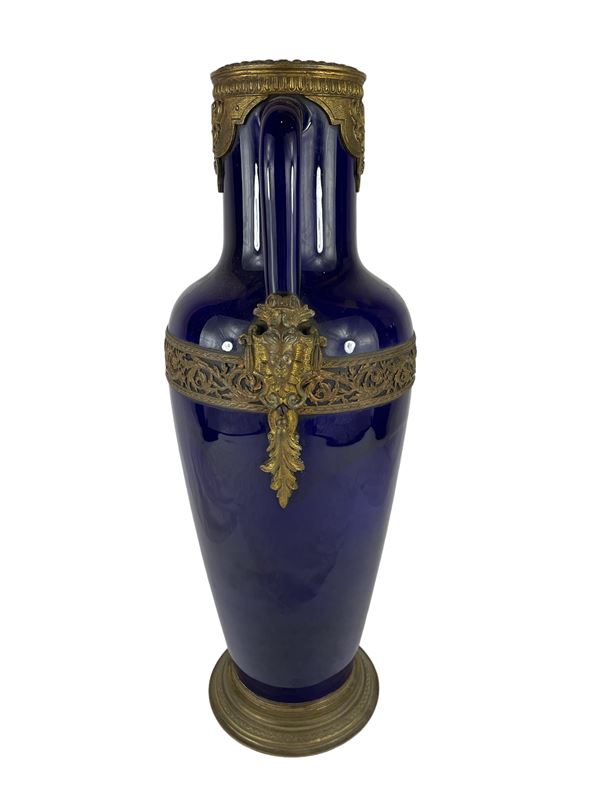 Vaso biansato in porcellana blu con finiture in bronzo a motivi floreali e a teste di arpia.