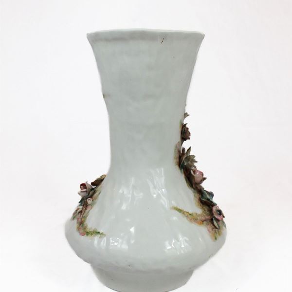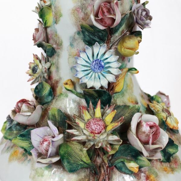 con decoro in plicromia a rilievo di fiori con arbusto, corpo piediforme, firmata con N coronata in nero sotto smalto. Piccolissime sbeccature ai fiori.