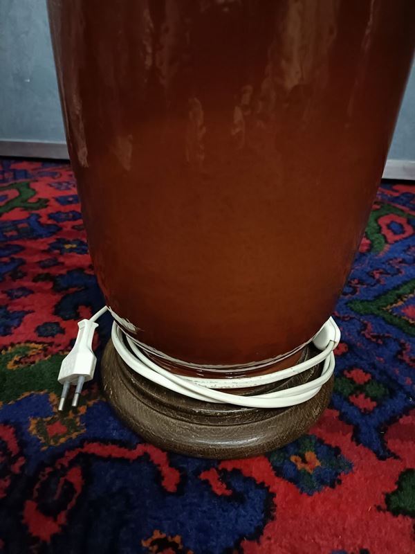 in ceramica color terra di Siena con base in legno, con paralumi.