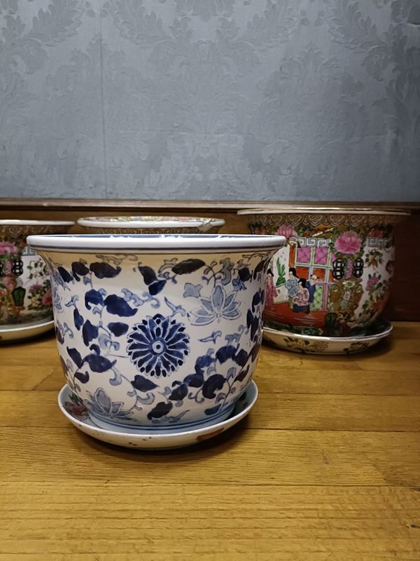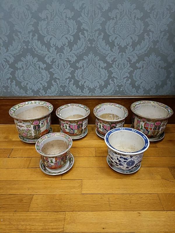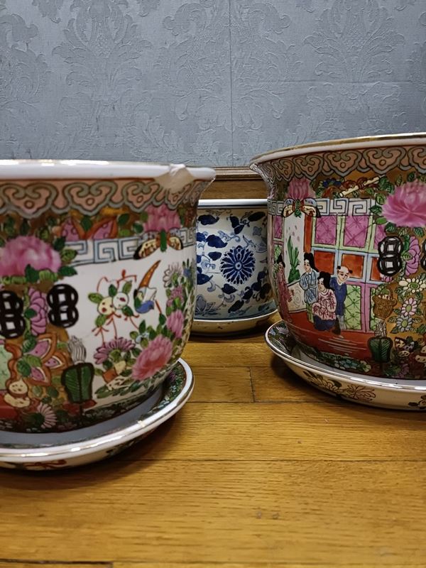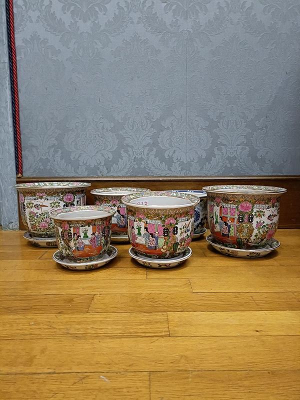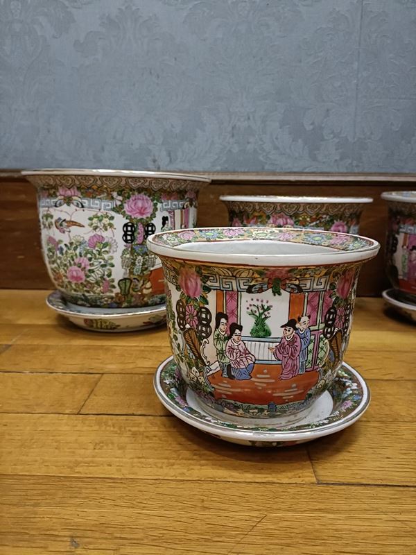 In porcellana, con decorazioni in stile orientale. Forati alla base, con piattini. Misure diverse, dimensioni del maggiore:18 x 14 cm alla base.
