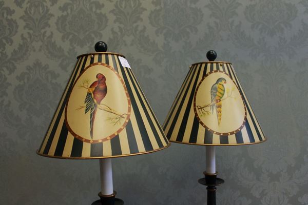 in metallo laccato verde e oro con paralume in latta a righe, avorio e verde, con decorazioni a volatili tropicali.
