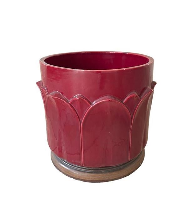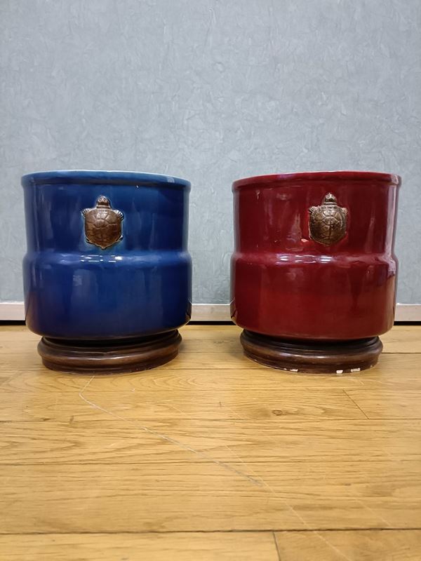 In ceramica monocroma, smaltati di colore blu e rosso. Decorazioni laterali a forma di tartaruga, con sottovaso in legno.