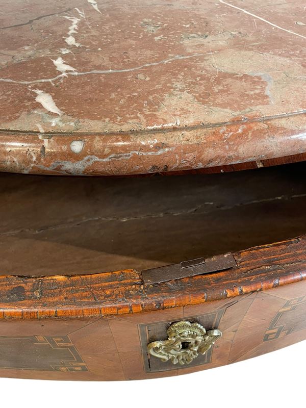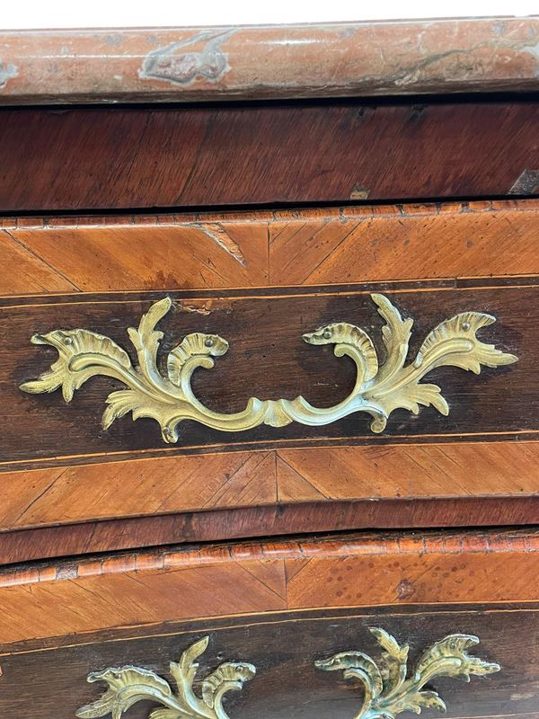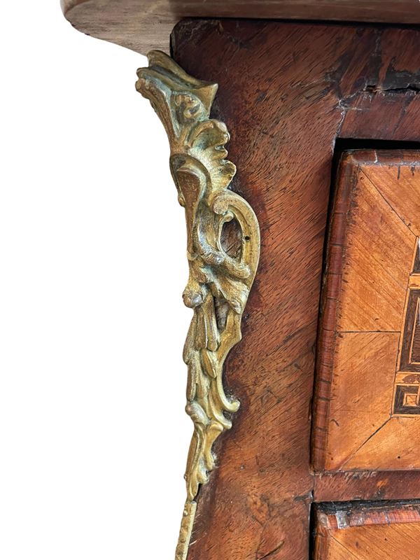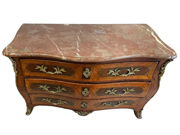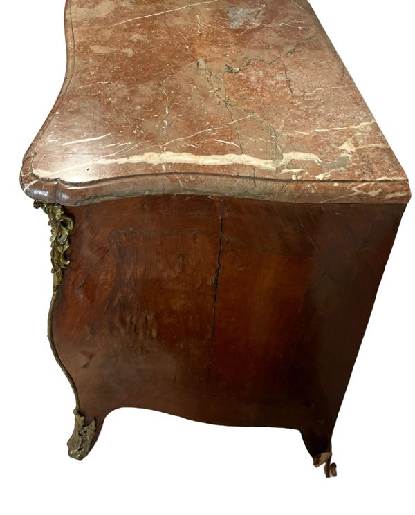 A tre cassetti. In legno di rosa, palissandro e intarsi in legno di frutto, con guarnizioni in bronzo e fronte bombato. Piano in marmo rosso di Francia.