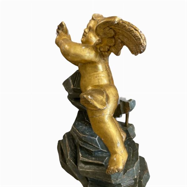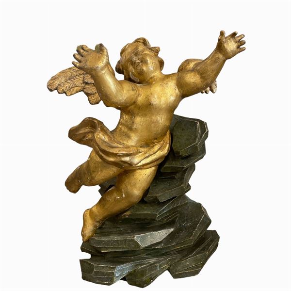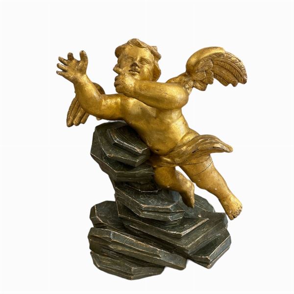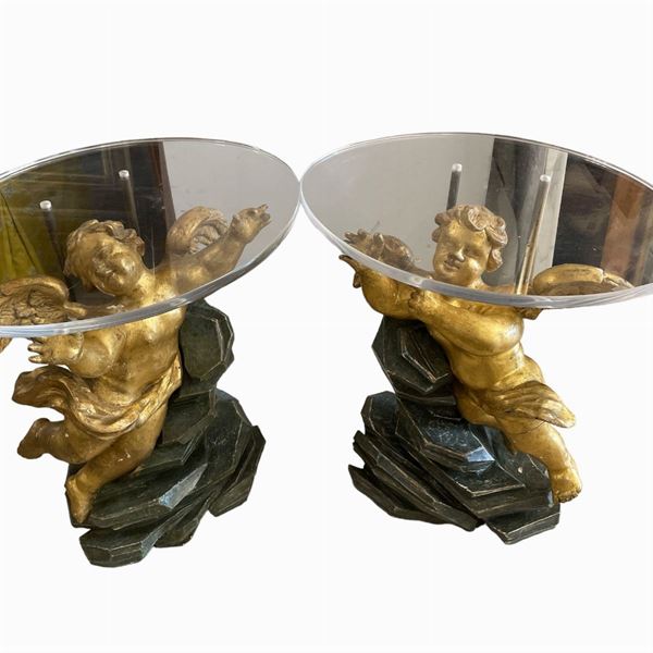 in legno intagliato e dorato, raffiguranti Putti alati. Adattati a tavolino, con piano in plexiglass. Le sculture dorate sono di manifattura romana periodo Luigi XIV, prima metΓ XIX secolo, le rocailles sono posteriori.