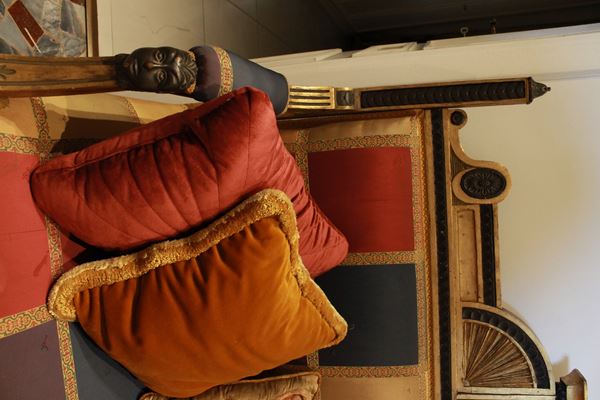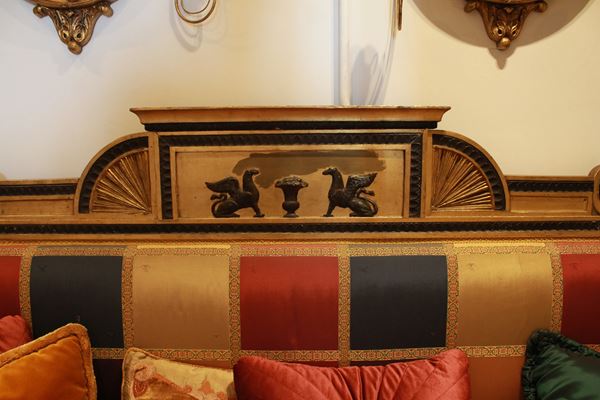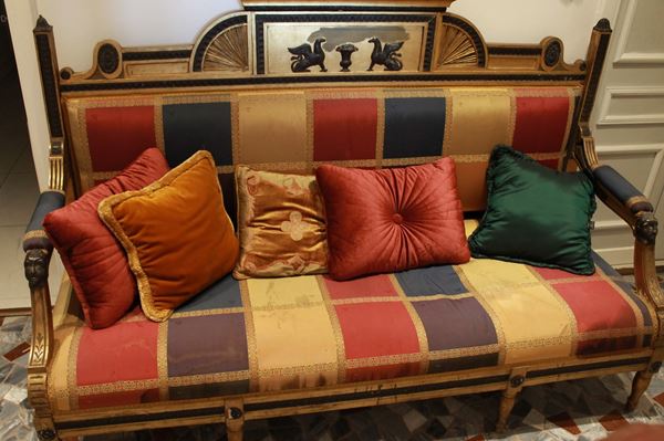 A tre posti in legno dorato e laccato nero e oro e intagliato. Completo di cuscini. Manifattura nordica - Retour d'Egypt. Provenienza: Casa d'Aste Bruun Rasmussen. La tappezzeria presenta macchie e difetti.