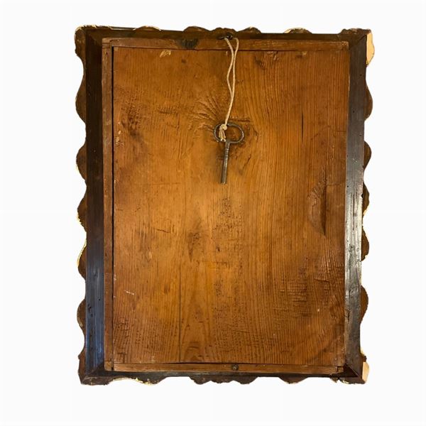 In legno dorato con intagli in pastiglia. Quadrante in smalto, suonerie ore e quarti. Meccanica da revisionare.