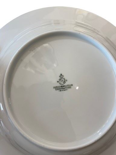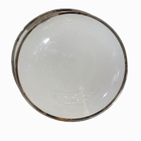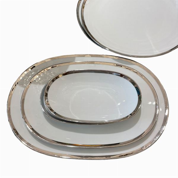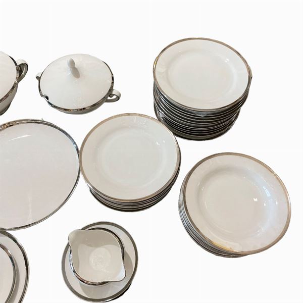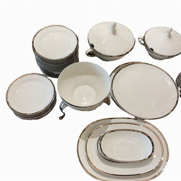con bordo in platino. Composto da: 11 piatti fondi, 23 piatti piani, 23 piatti da dolce, 2 zuppiere con coperchio, 1 salsiera, 1 insalatiera, 2 piatti da portata rotondi, 2 piatti da portata ovali piccoli, 2 piatti da portata ovali.