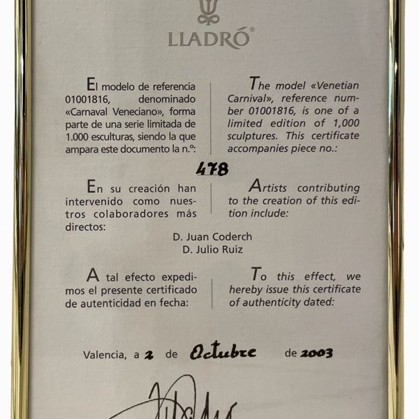 Scultura in volume in porcellana policroma, con due personaggi in costume carnavaleschi. Modello firmata, stampato e numerato, con certificato di garanzia. Manifattura LladrΓ².