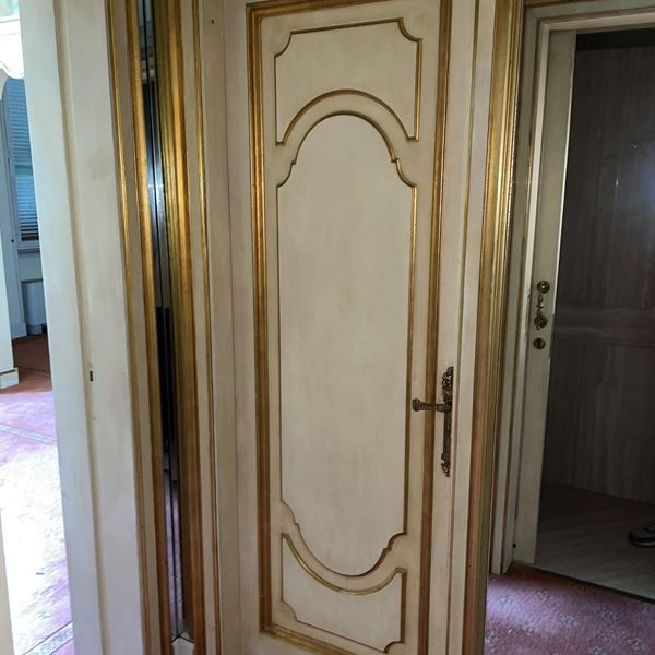 laccate e decorate, maniglia presente su ambo i lati, sottile fenditura per areazione nella parte inferiore. Una delle due specchiata su un lato. Misure cornice H 223 x 103 cm, porta H 213 x 82 cm, spessore imbotto 15 cm - 20 cm