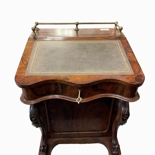 a 8 cassetti con calatoia, 2 cassettini interni e 1 porta pennini. In radica di noce e betulla. Finiture in ottone