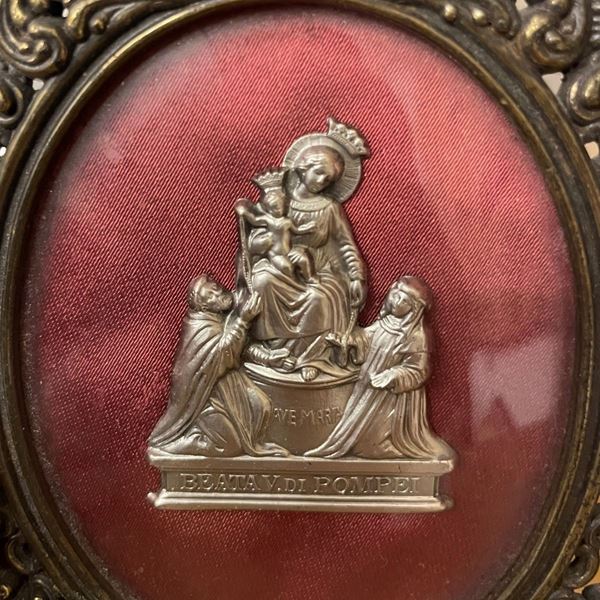 Ricordo della Beata Vergine di Pompei, in metallo argentato, in cornice, in forma ovale. Misura 12,5 x 10 cm