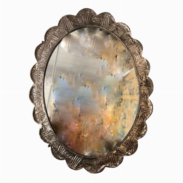 Specchiera in metallo argentato, di forma ovale. Parte sbalzata ed incisa. Misura 21 x 16 cm