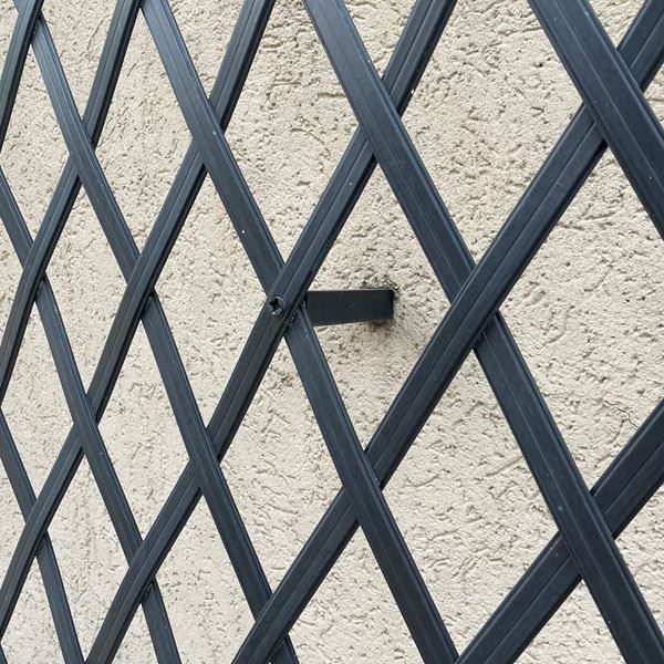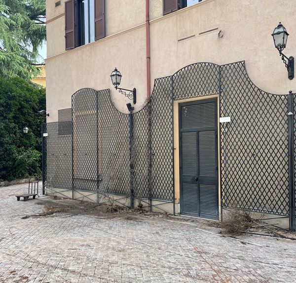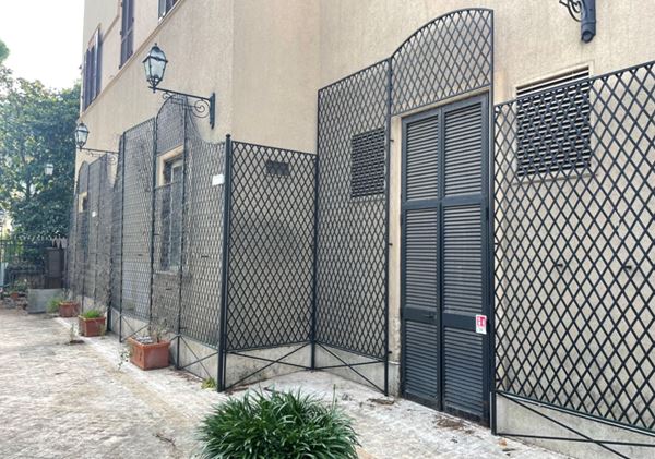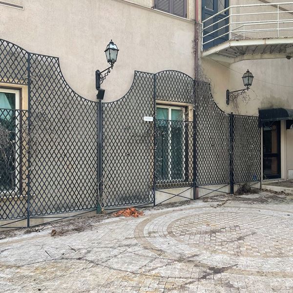 in ferro modellato a mano, motivo a graticcio, montante a plinto, profilo curvilineo. Altezza massima 430 cm, larghezze dei pannelli massima 220 cm - minima 150 cm.