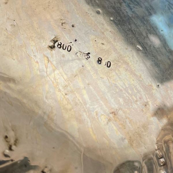800 su 1000, di forma circolare polilobata, parti incise a rilievo su tre piedi d'appoggio a virgola. Peso grammi 304