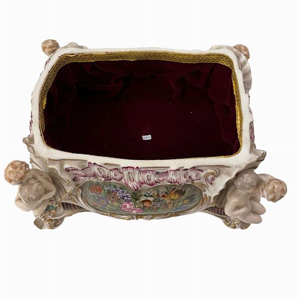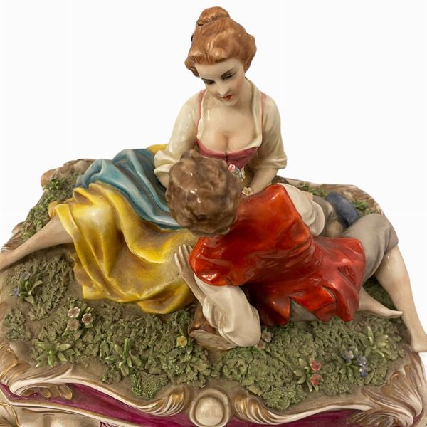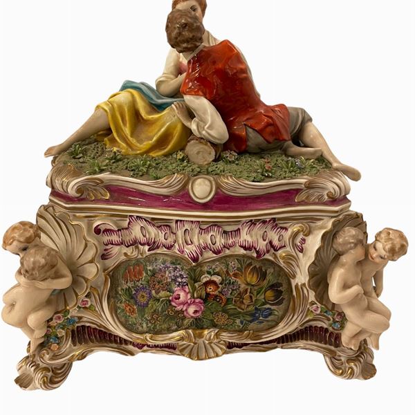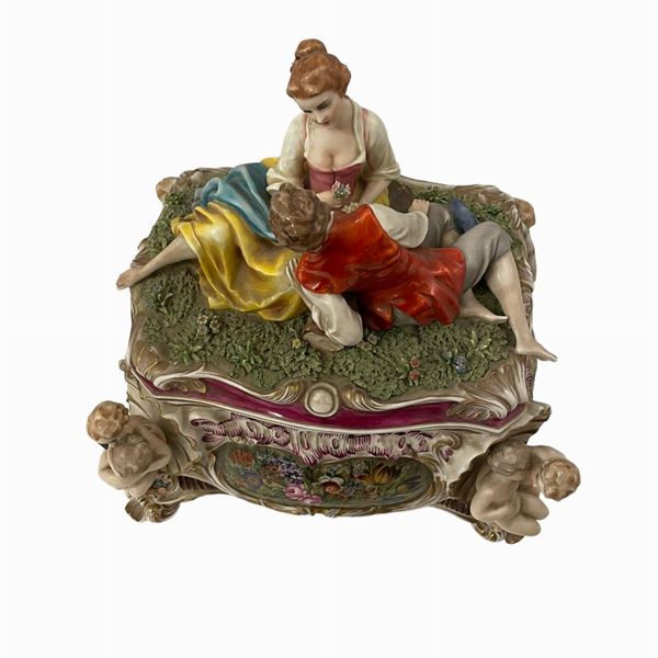 Cofanetto in porcellana policroma, con scena galante sul coperchio e coppie di putti agli angoli in rilievo. Manifattura Luigi Fabris