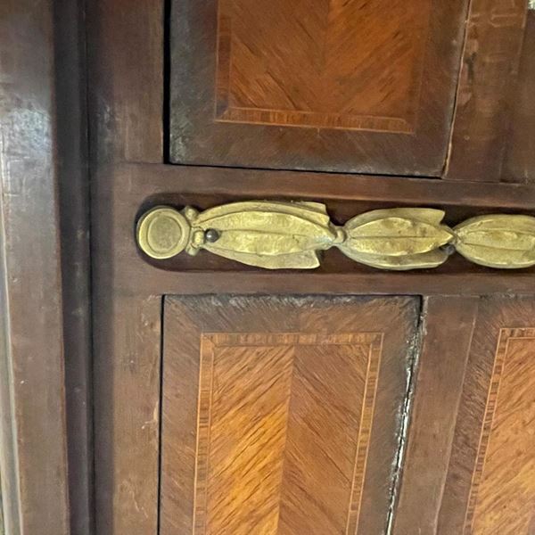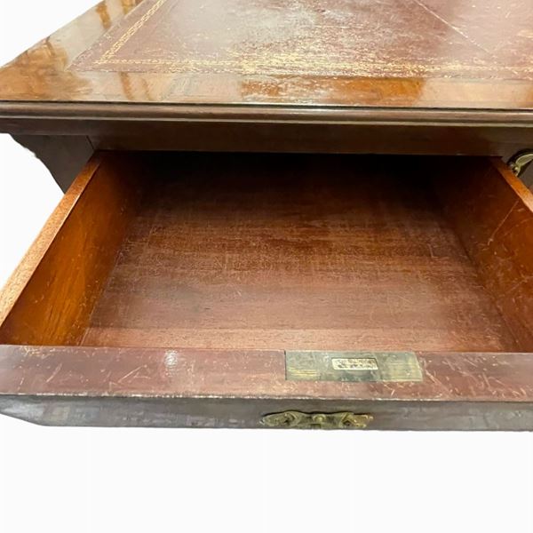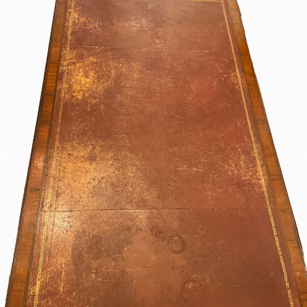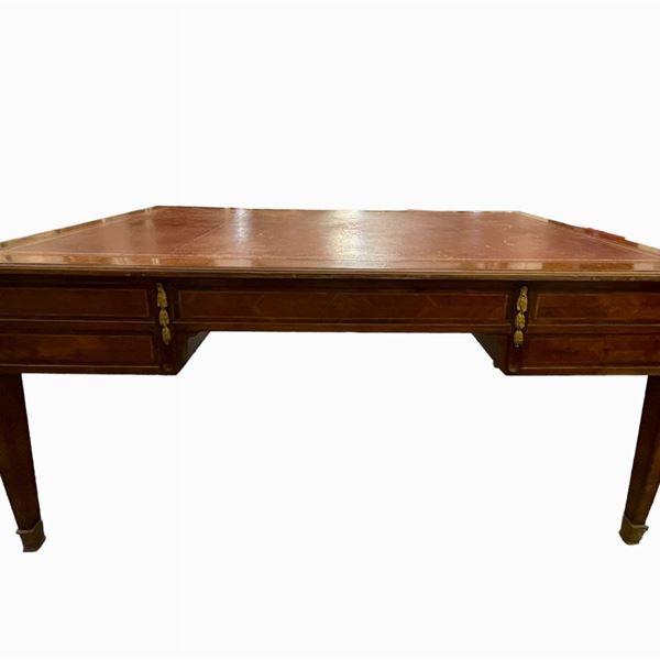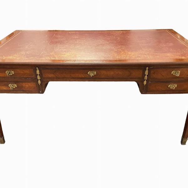 in legno di rosa, con cinque cassetti. Decori in bronzo dorato. Quattro gambe a tronco di cono desinenti con cappuccio in bronzo. Piano superiore in pelle marocchino rosso, decorato in oro. Manifattura francese.