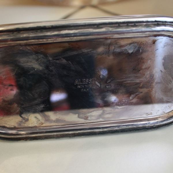 composto da 1 vassoio rotondo Diam. 44 cm, 2 alzate in metallo argentato con stemma H 14,5 x  Diam 24 cm, 1 oliera modello 5074 (Alessi by Ettore Sottsass) priva di bottigliette, in acciaio inox (18/10) 18 x 17 x 7 cm