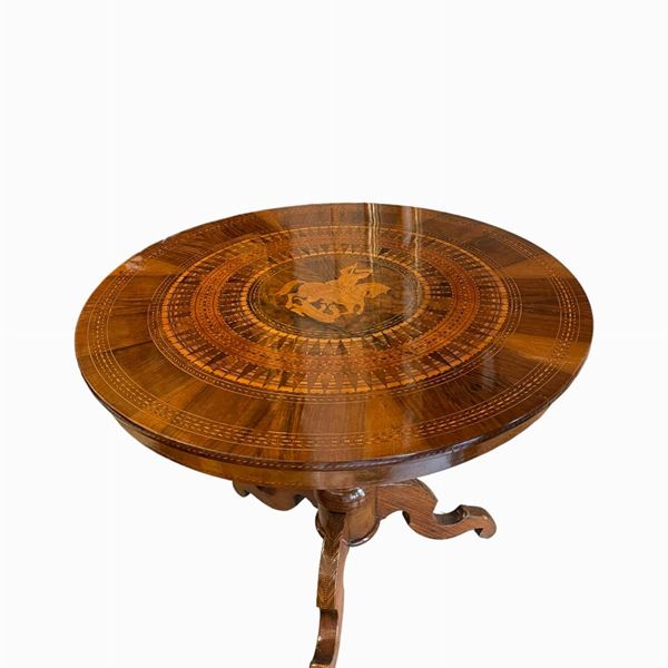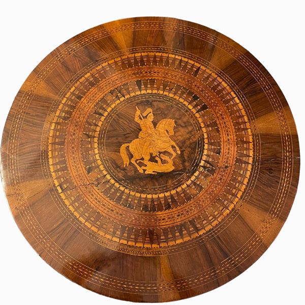 in legno di noce, con intarsi in legno di frutto e decoro centrale. Piede centrale. Manifattura sorrentina