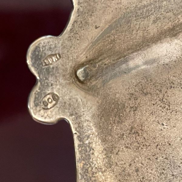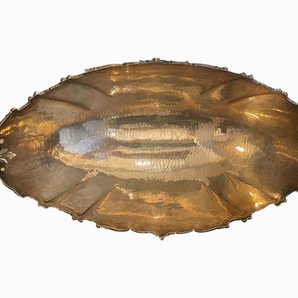 800 su 1000. Centrotavola a barca, corpo costolato, anse fogliacee. Base d'appoggio a quattro gambe con conchiglia, con due inserti laterali entro riserva in agata verde. Peso grammi 1134. Manifattura italiana