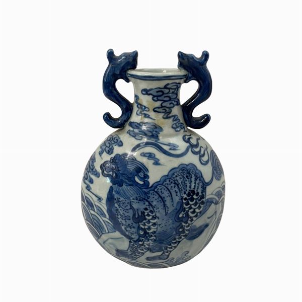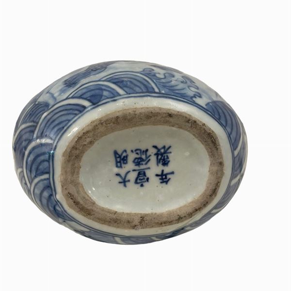 in porcellana bianco e decoro blu, con decoro floreale e animali, corpo globulare, anse a pesce. Ultimo periodo dinastia Quing
