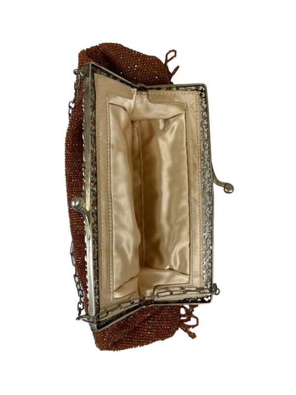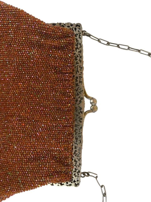 In stoffa a perline rosso oro, con frange e montature in argento 800 su 1000.
