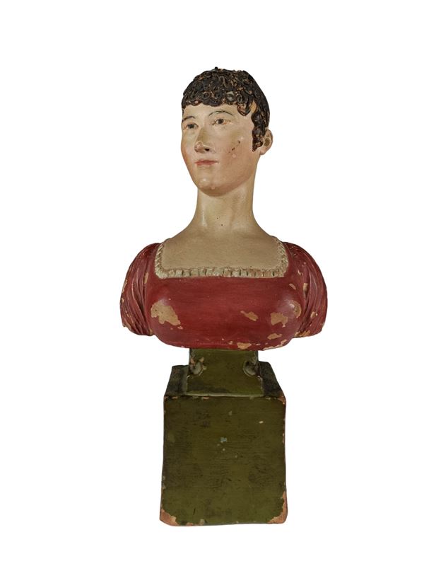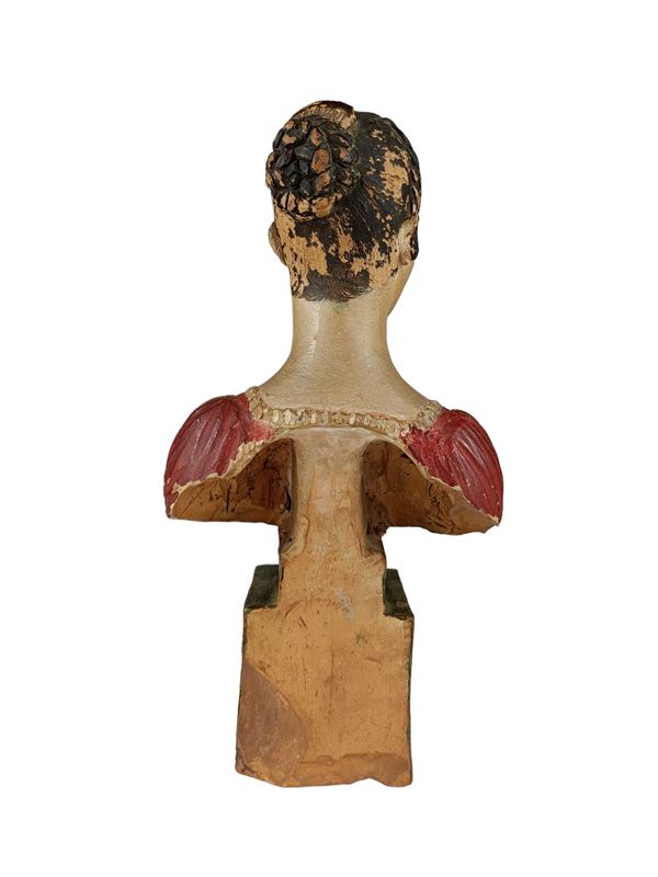 Scultura in volume, modellata in ceramica, di gusto neoclassico, con capelli neri e veste porpora, dipinti a freddo. Caduta di colori in piรน punti