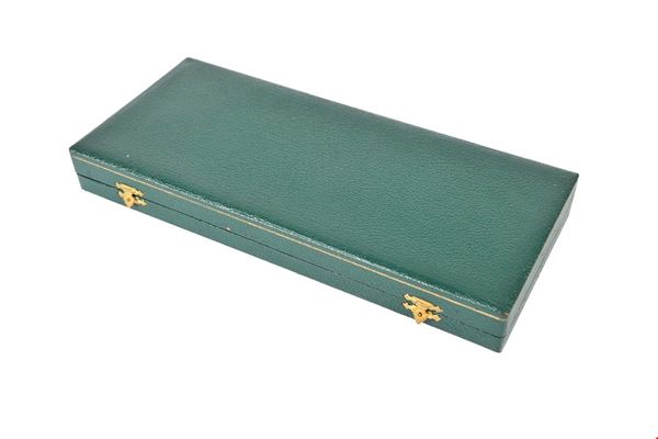 Composto da 6 coltelli, 2 palette da dolce, 6 forchette, con manici in argento 800/1000, entro astuccio. Parti rotte e staccate.