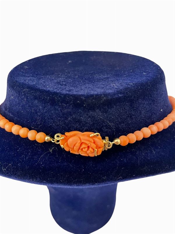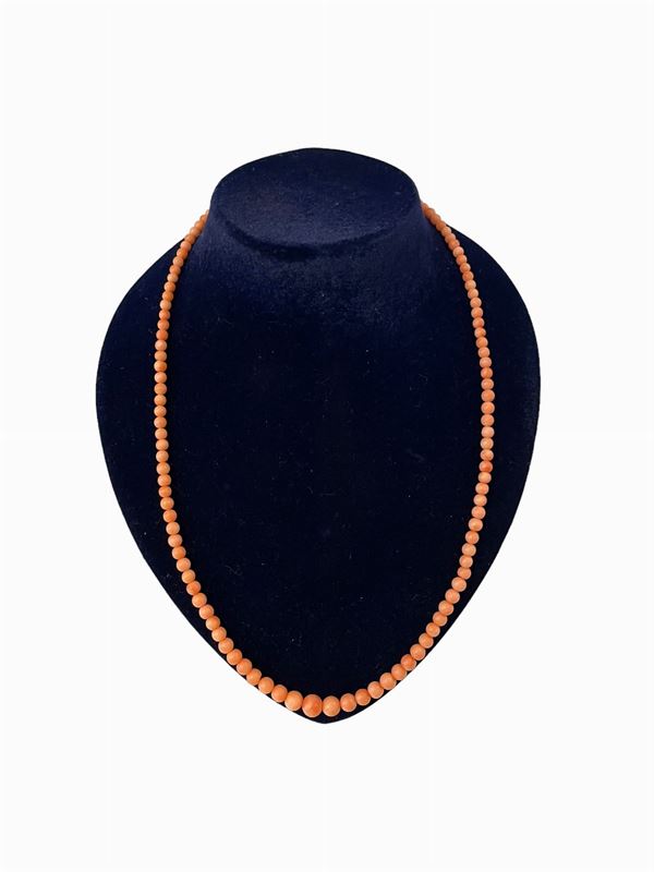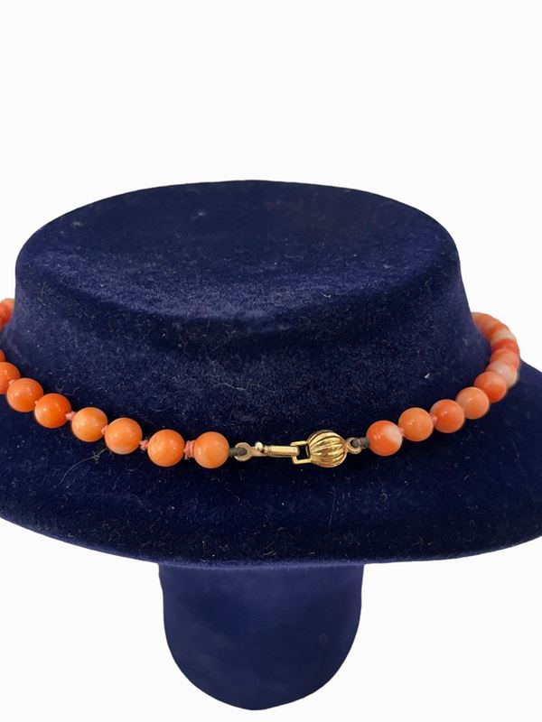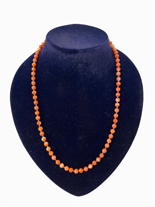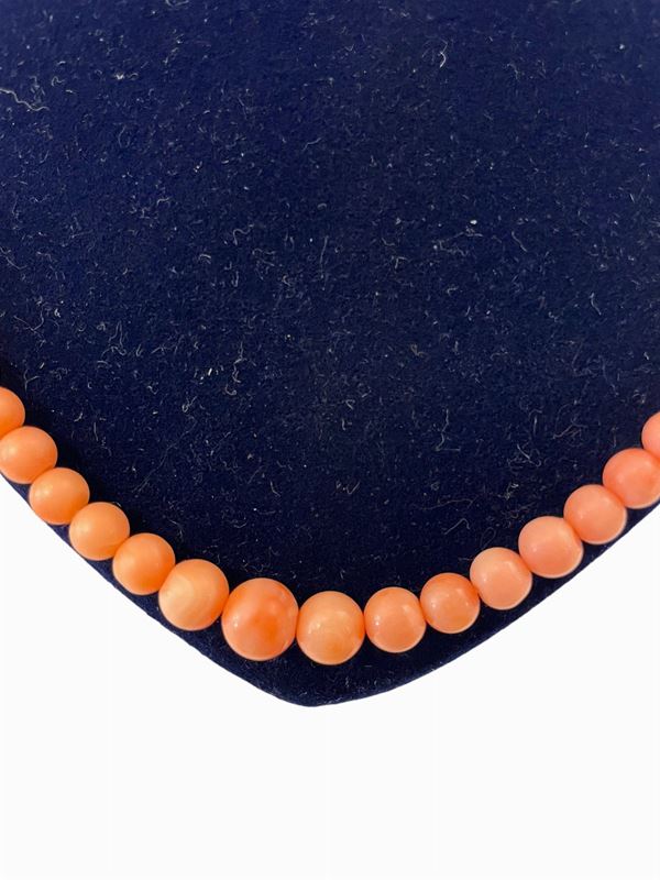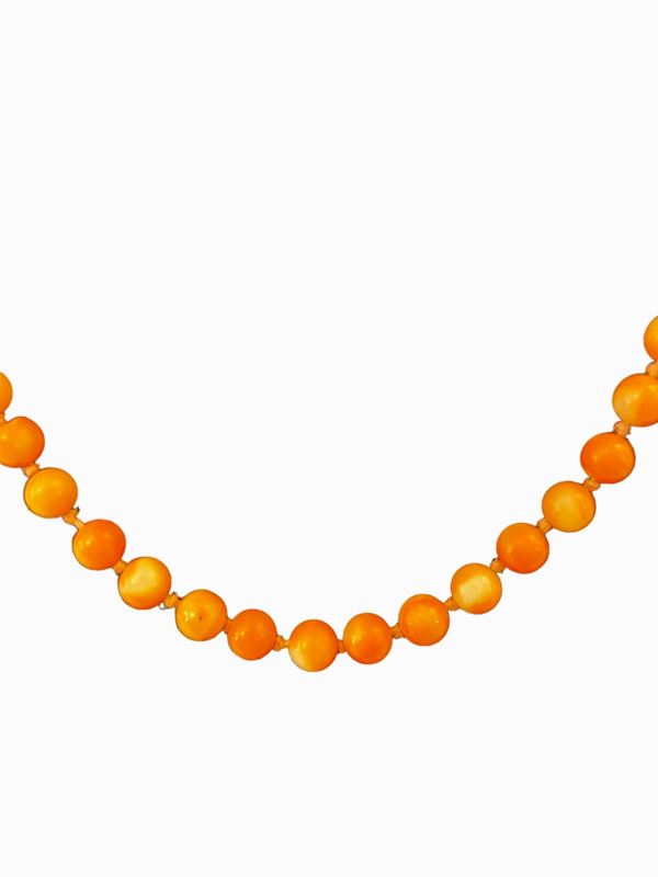 La prima collana รจ lunga 60 cm con grani tondi a scalare e fermezza in oro, grammi 26,4. La seconda collana รจ lunga 53 cm, con grani tondi regolari, fermezza in oro, pesa 18,4 grammi. Totale grammi 44,8