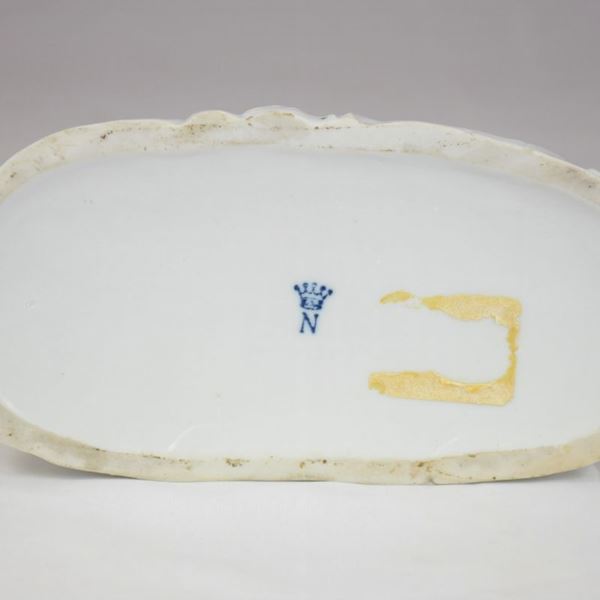 Scultura in volume in porcellana bianca con N coronata blu sottosmalto. Mancante di una mano e lieve scalfitura alla base