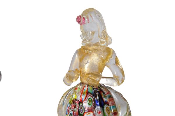 Sculture in volume in vetro policromo, con puleghe in oro. Piccole mancanze alle mani.