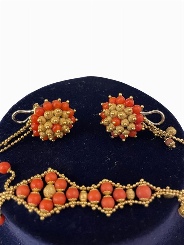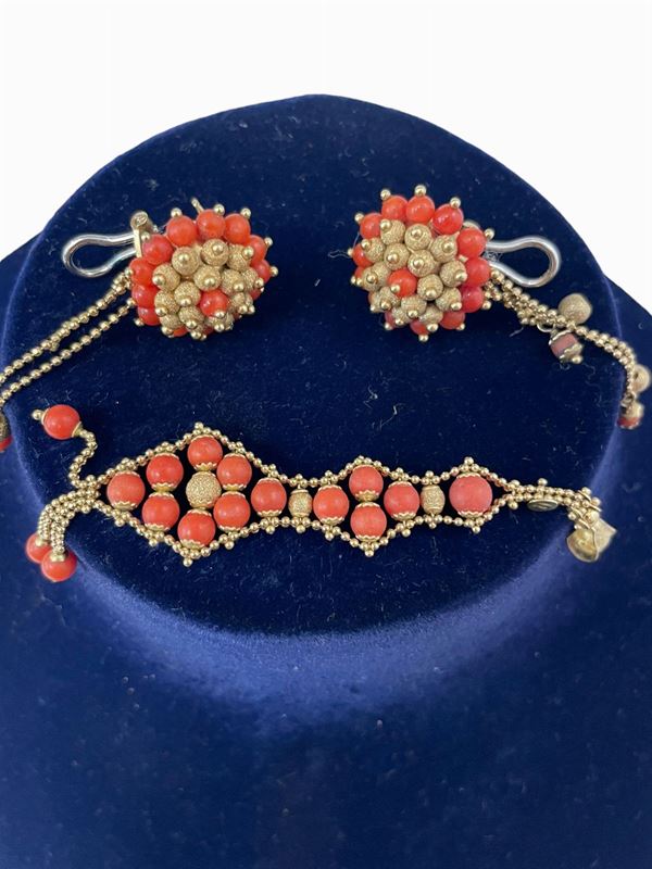 In oro giallo 750 kt18 e oro rosso, totale grammi 16,2. Orecchini a clipes. Manca un pendente ed una pallina ad uno dei due orecchini. Oreficeria italiana XX sec.