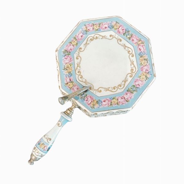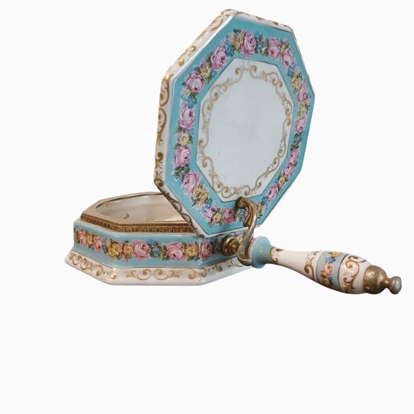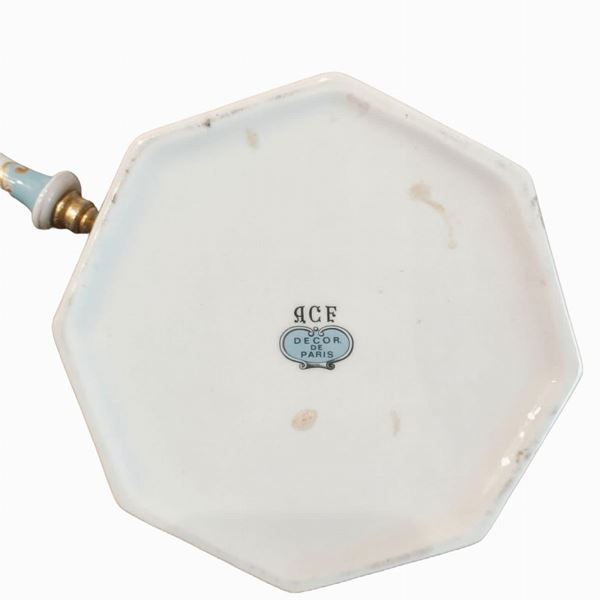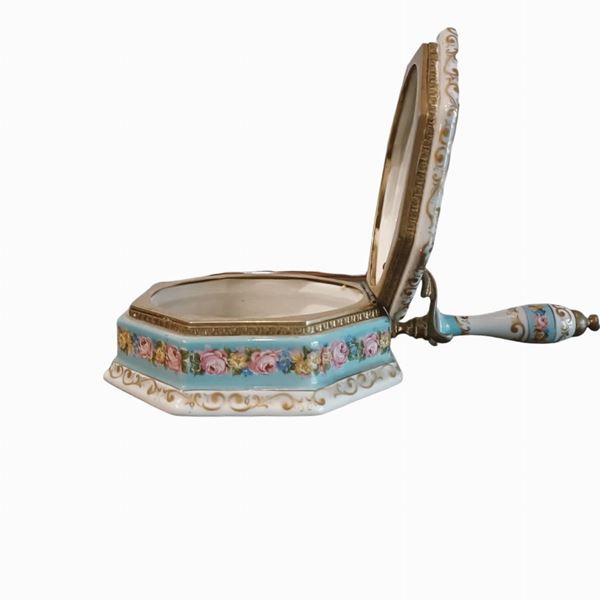 In porcellana di forma ottagonale, con decoro floreale su fondo azzurro e bianco. Finiture in oro zecchino con guarniture in bronzo. Manifattura francese, marchio sotto la base