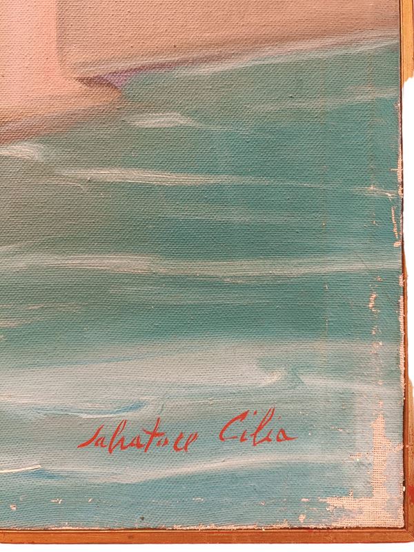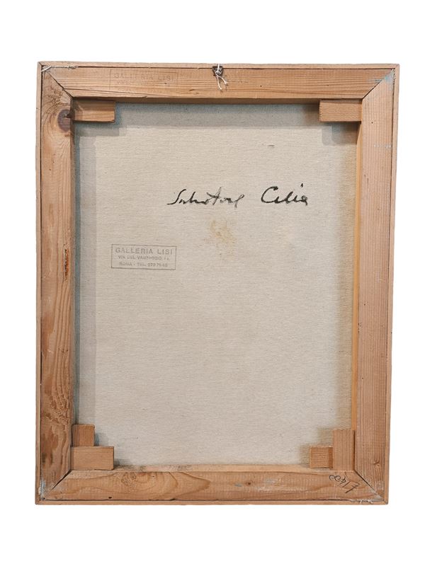 firmato in basso a desttra, piccolo strappo della tela. Provenienza: Galleria Lisi, Roma, timbro sul retro