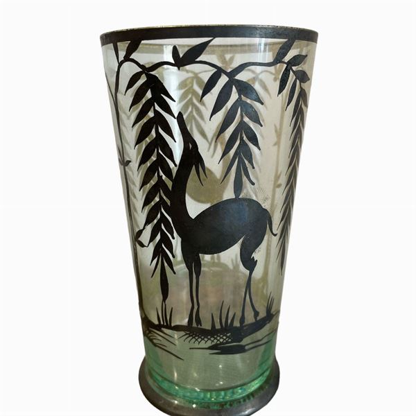 Composto da sei bicchieri e una brocca, in vetro con applicazioni dorate. Altezza brocca: 27 cm