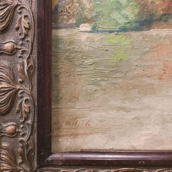 In cornice coeva. Veduta del lago con tempio di Villa Borghese, firmato sul fronte in basso a sinistra. Artista facente parte del gruppo di pittori di Villa Strohl-Ferm. Esule da Spalato si trasferì a Roma negli anni '20, dove morì negli anni '50.