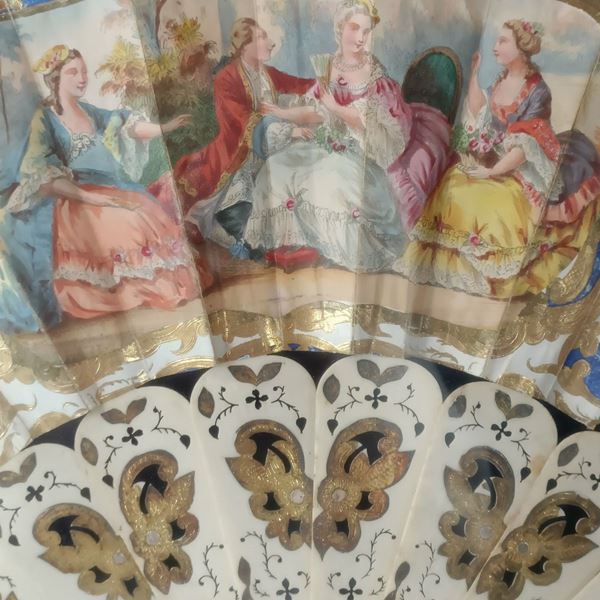 Ventaglio dupleface in carta stampata e dorata a mano, con scene di genere entro riserve dorate, montate su fanoni di balena, in parte dorati. Danni alla carta, parti staccate ed usurate. 60 x 37 x 5 cm
