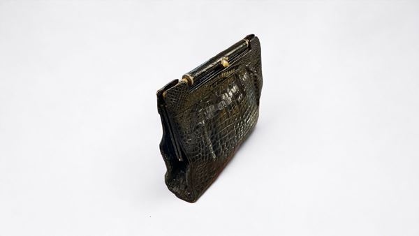 Clutch con tracolla e hardware dorati (h. 52 cm). Qualche segno di usura.