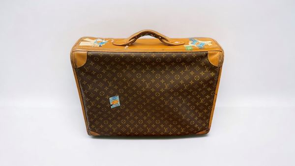 In tela monogrammata, con parti in ottone, 4 piedini protettivi alla base. Doppie tasche interne. Etichette di viaggio. Molto usurata, macchie.