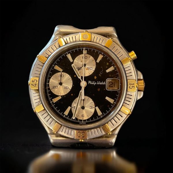 Orologio cronografo con cassa in acciaio satinato e lucido, lunetta girevole unidirezionale in acciaio satinato con elementi placcati oro giallo lucidi. N. serie: 522839.