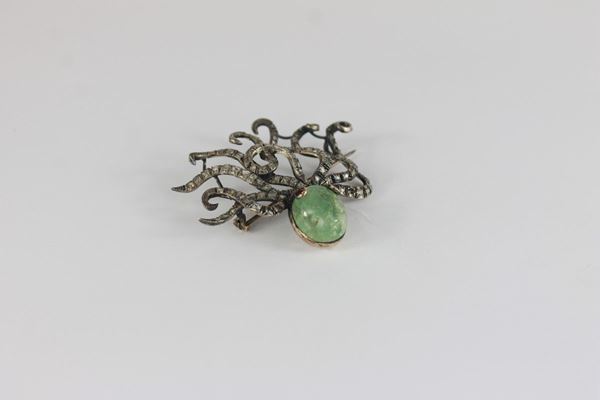 in argento con diamanti, piccoli rubini e acquamarina verde, peso totale 15 gr.
